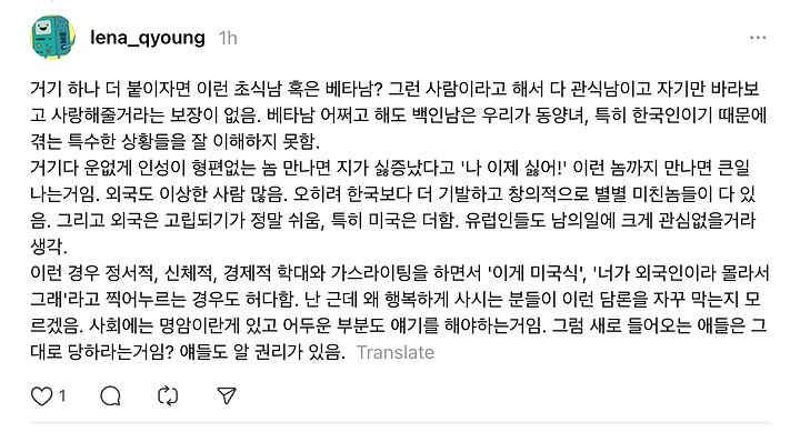 근데 이건 아냐. 쓰레드 두달 하면서 한국이라는 사회의 분위기를 좀 알게 되었음. 그 전에는 마음은 가까워도 멀리 있었기 때문에 ‘저 나라는 왜저러지’하면서도 본격적으로 신경을 못썼거든?
